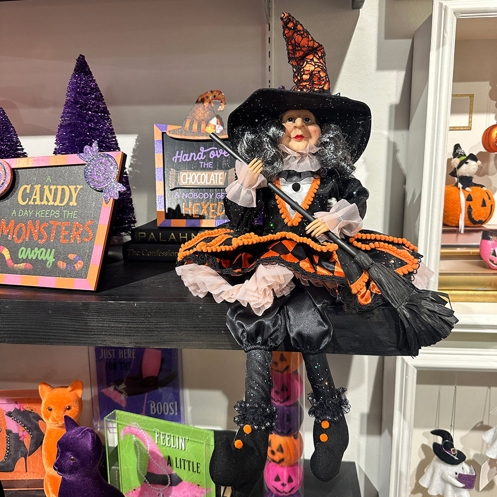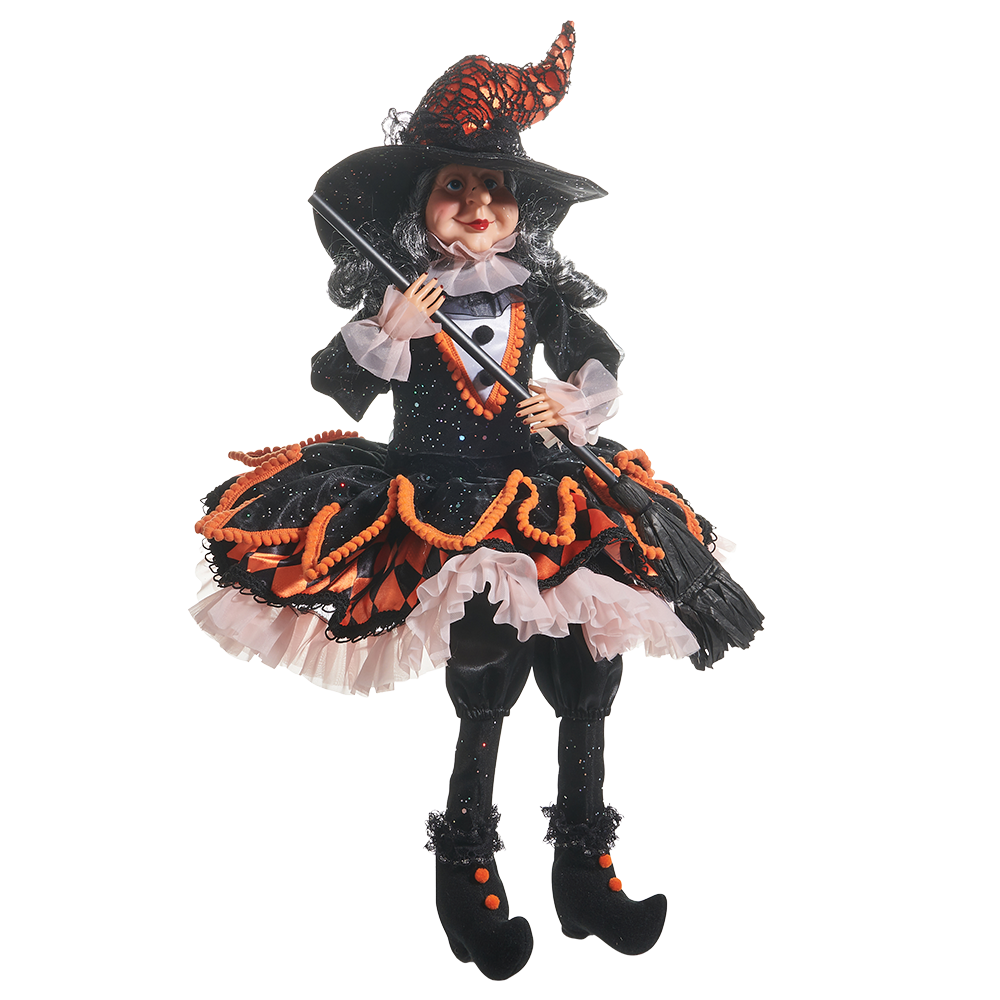 Ze heeft haar bezem gepoetst, haar rok opgezwierd en haar zwarte magie afgestoft — deze heks is klaar voor het Halloween-feest! Glinsterend in glitters, tule en een feestjurk in traditioneel oranje en zwart, voegt ze een vleugje glamour toe aan je griezeldecor. Met haar zwarte bezemsteel en lieve blik is ze meer modieuze tovenares dan enge heks — precies het soort decor dat je jaar na jaar met trots laat staan.